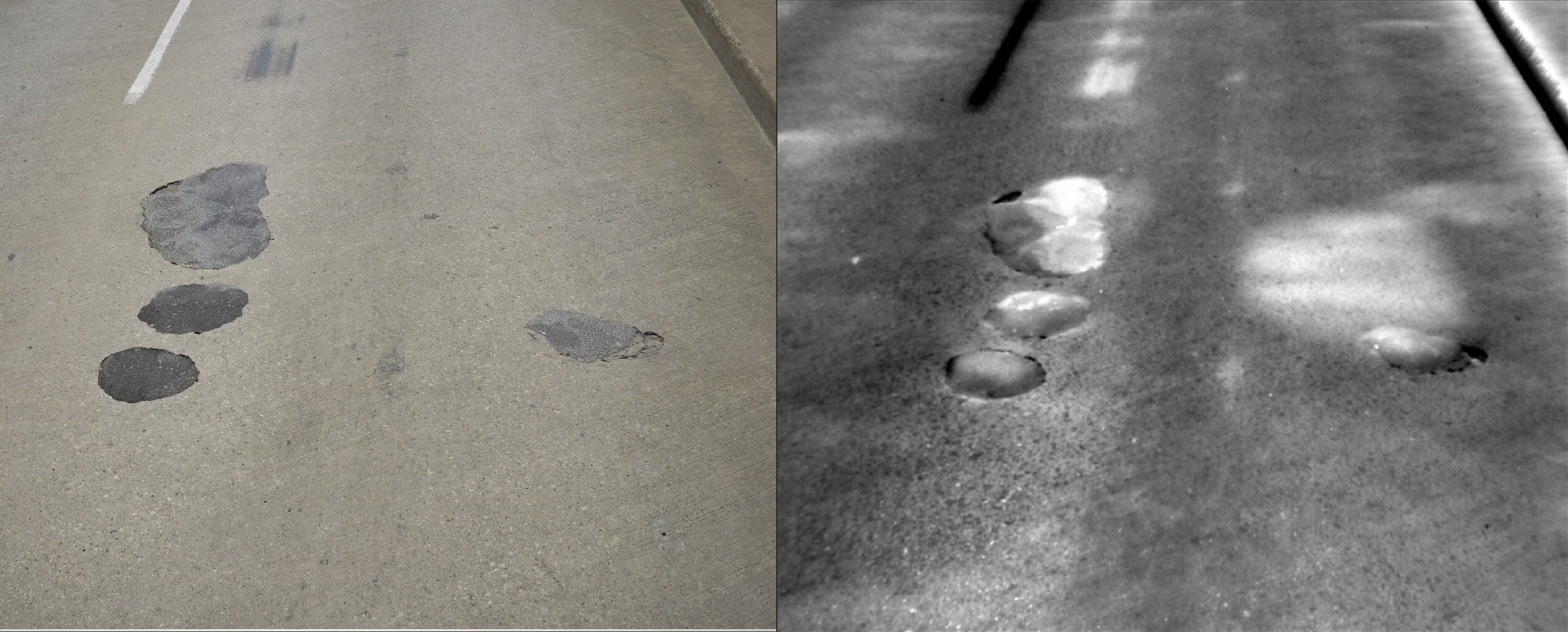 Analyzed to quantify and map deck delamination and/or overlay debonding. White blotchy areas on the IR images are “hot spots” where the surface temperature is higher, indicating thermal barriers caused by delaminations. For decks with overlays, these “hot spots” can be attributed to either debonding of the overlay or delamination at the rebar level.